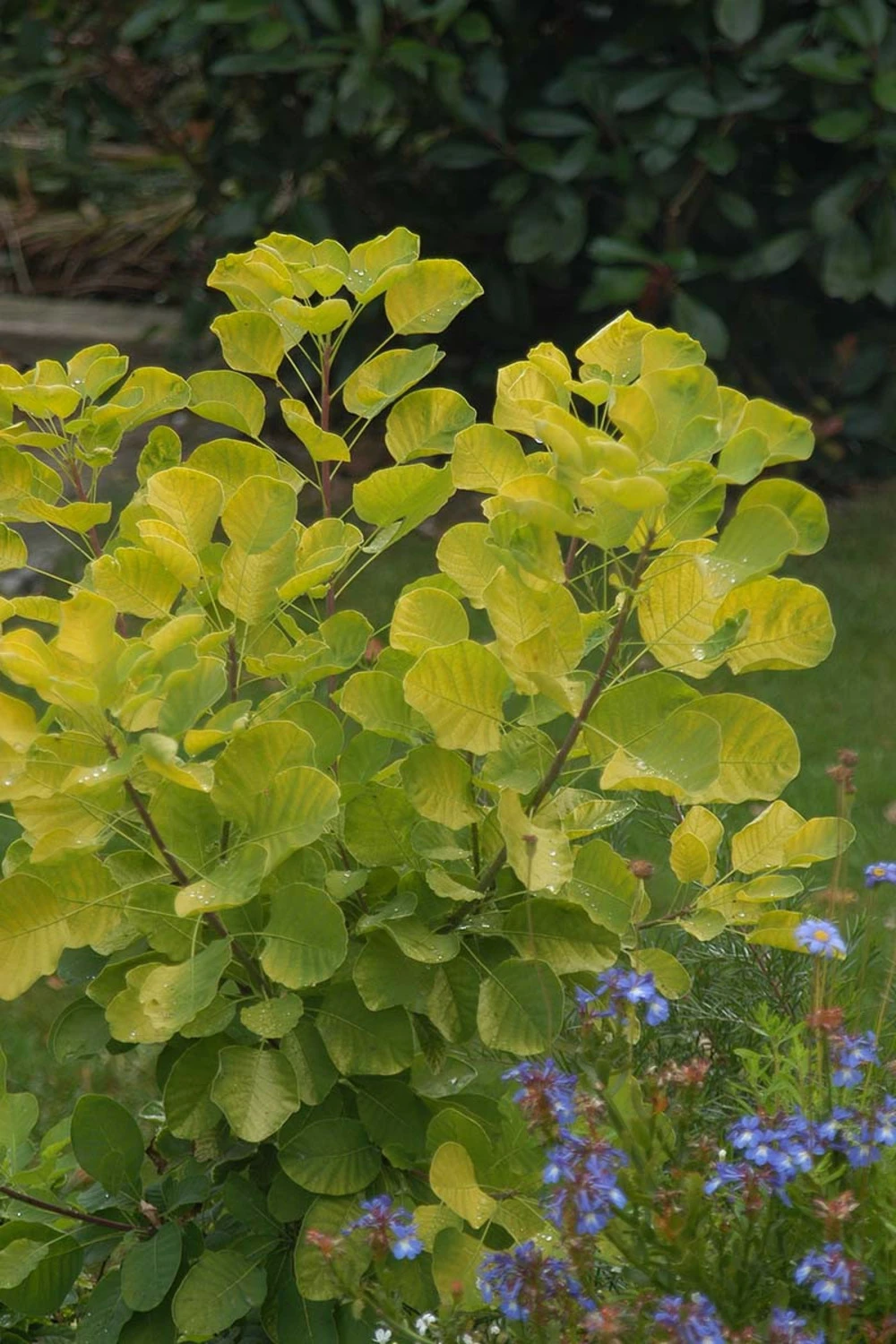 ce cotinus va aimer la compagnie de plantes plus graphiques comme les graminées, les miscanthus, ou aussi les plantes plus structurées, taillées en rond par exemple les pittosporum à qui il va apporter lumière et légèreté ce grand arbuste si lumineux peut aussi être associé avec bonheur à une haie libre et fleurie en association avec d’autres arbustes