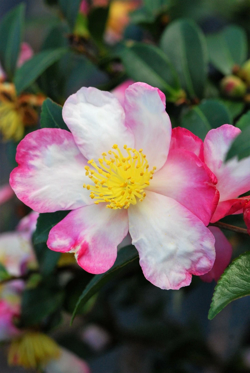 du parfum et de la couleur ! D’un bouton rose foncé à une fleur blanche bordée de rose, un feuillage à la teinte brillante, un coeur doré… Une variété qui insuffle fraîcheur et authenticité à la fois. Ce camélia d’automne se plaît au coeur d’une haie basse ou palissé. Mieux encore, il peut être sculpté à la forme souhaitée.