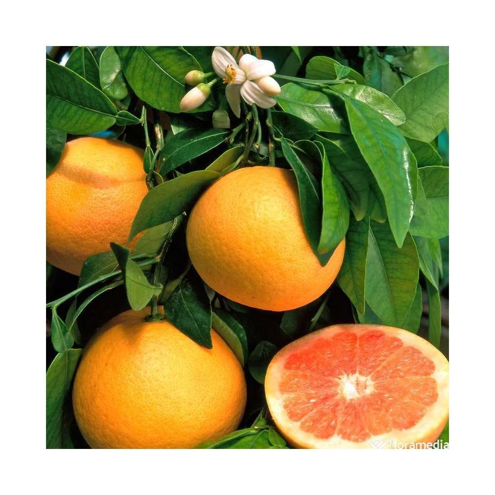 Originaire des Antilles, le Pomelo (Citrus x paradisi) est un hybride du Pamplemoussier (Citrus grandis) qu’il a remplacé dès le XVI ème siècle. Il existe plusieurs variétés à chair rose.’Star Ruby’ est l’une de ces variétés.Ce Pomelo atteint une hauteur de 8 m pour une largeur de 5 m. Feuillage persistant, vert plus clair dessous. Feuilles de 10 à 15 cm, épaisses, ovales, pointues. Floraison blanche, parfumée, de novembre à mars, en même temps que les fruits. Ceux-ci mesurent de 10 à 15 cm. Ils se cueillent dès qu’ils commencent à se colorer. Chair rose, juteuse et sucrée. Rustique jusqu’à -7°C.On les plante en France sur la Côte d’Azur en pleine terre, dans un sol léger, humifère, bien drainé. Exposition au soleil, à l’abri des vents forts. Partout ailleurs, culture en pot en rentrant la plante de novembre à avril dans une véranda tenue hors gel, à une température comprise entre 5°C et 10°C.